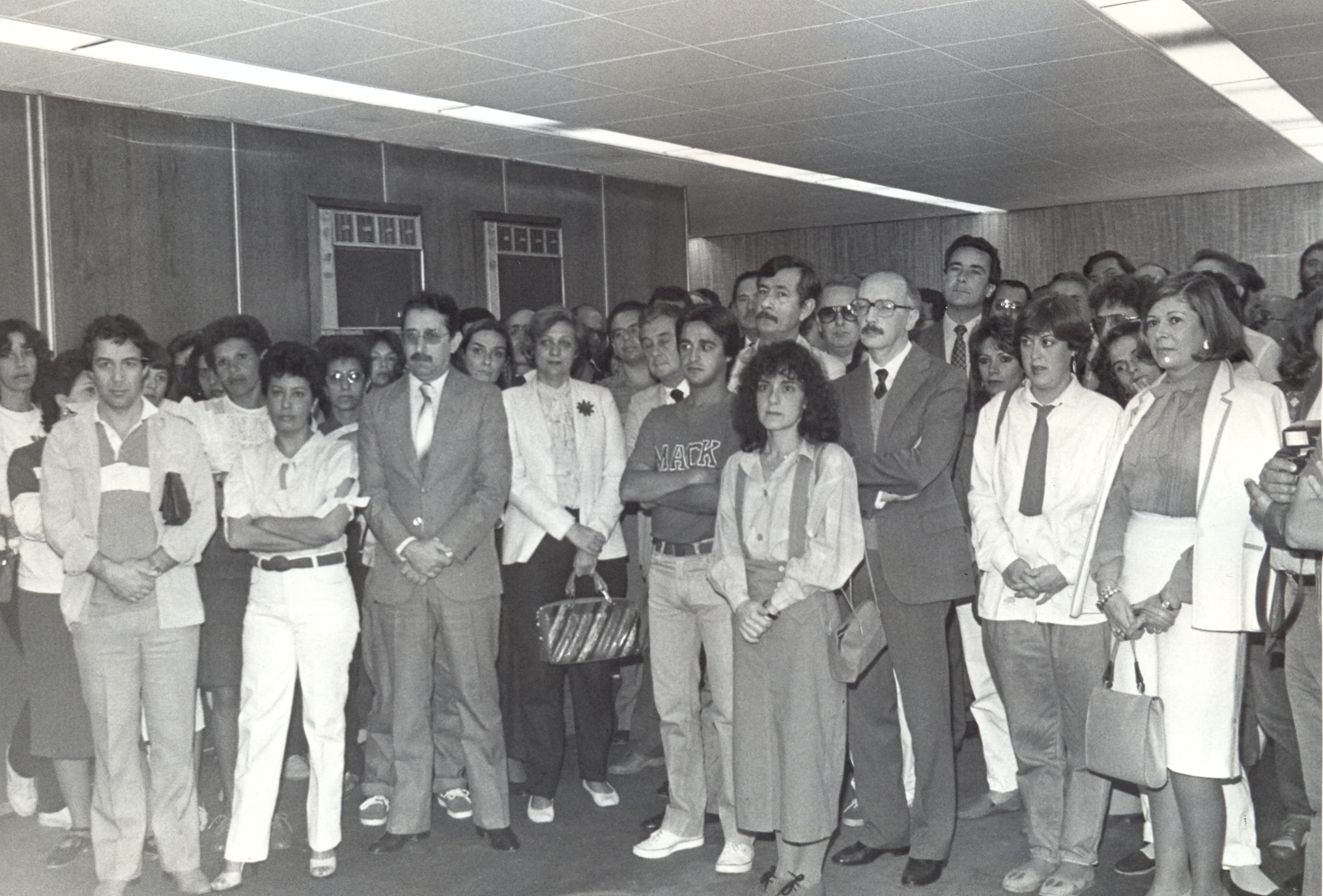 Solenidade de transmissão do cargo de presidente da Fundação João Pinheiro (FJP), para Hindemburgo Chateaubriand Pereira Diniz, no salão nobre da FJP, por Carlos Eduardo Côdo Aroeira, presidente em exercício. Vê-se os funcionários da FJP.