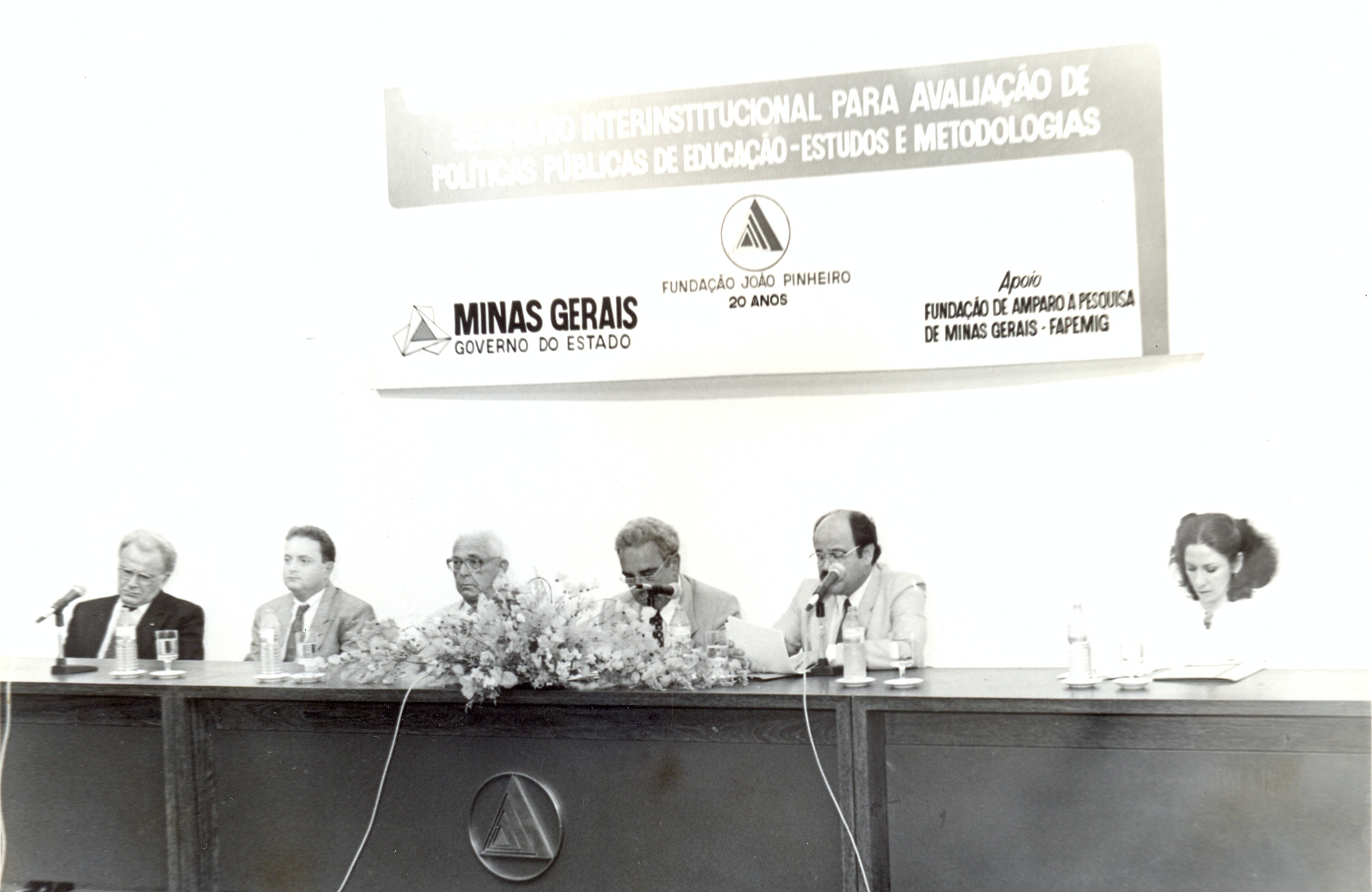 Abertura do “Seminário Interinstitucional para Avaliação de Politicas Publicas de Educação – Estudos e Metodologia” promovido pela Fundação João Pinheiro (FJP) com apoio da Fundação de Amparo à Pesquisa do Estado de Minas Gerais (FAPEMIG). Vê-se a partir da esquerda, Ulisses de Oliveira Panisset, presidente do conselho Estadual de Educação; Sílvio Campos Horta, representante do secretário de Planejamento; Gerson de Brito Mello Boson, secretário de Estado da Casa Civil; Gamaliel Herval, secretário de Educação; Roberto Gonçalves Pereira, presidente da FJP e Sonia Lamounier Girard, representante do Ministério da Educação.