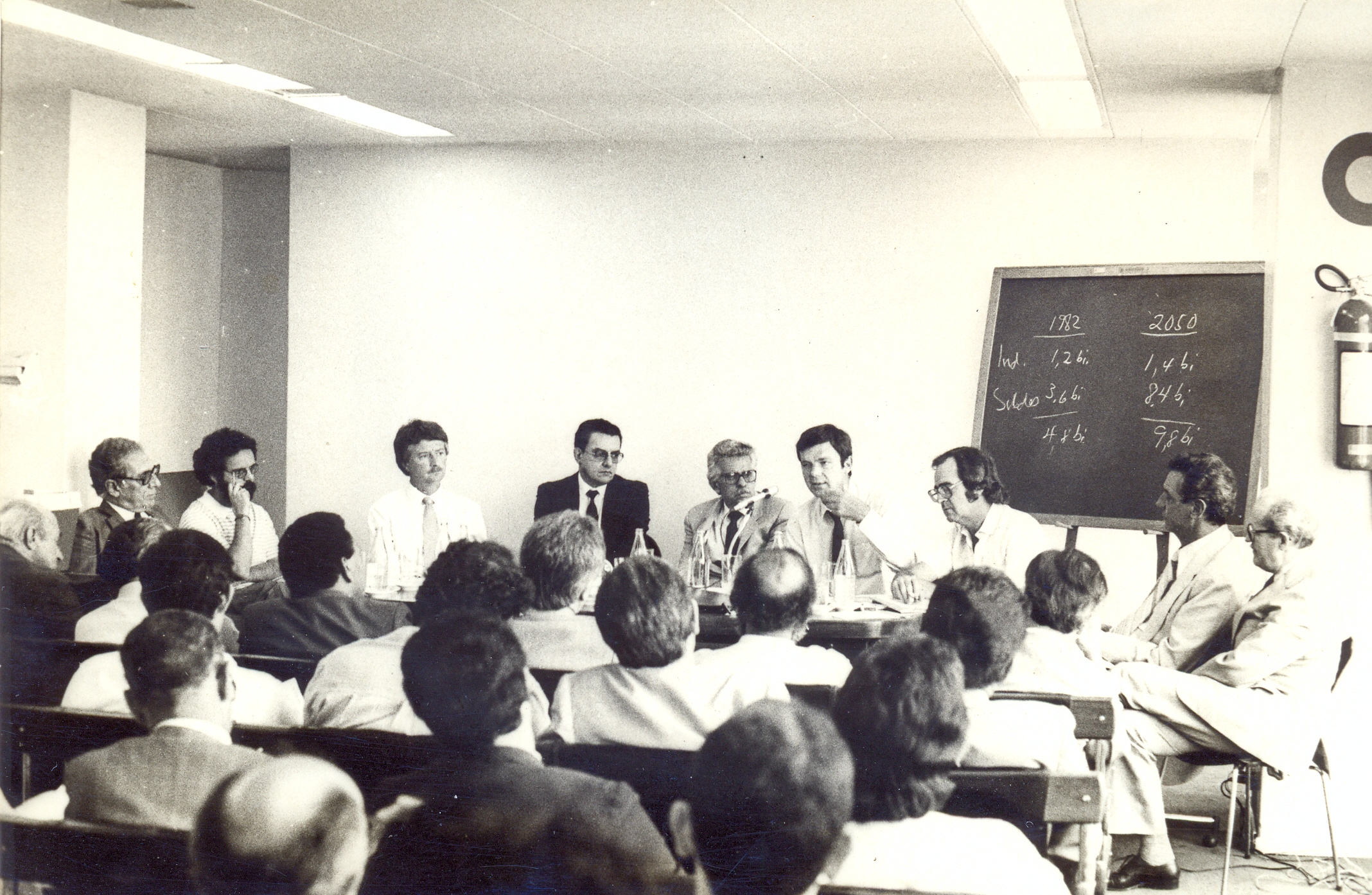 Técnicos do Banco Mundial em reunião na Fundação João Pinheiro (FJP). Vê-se os componentes da mesa e a platéia.