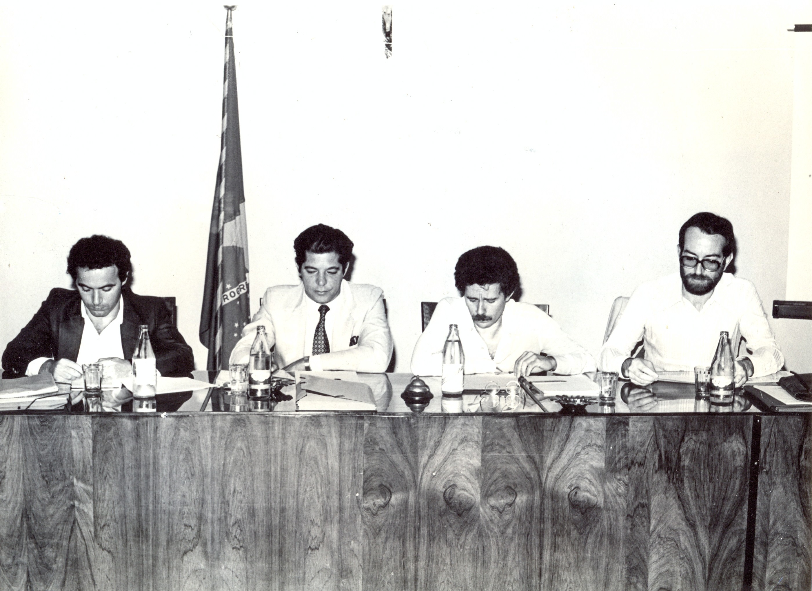 II Encontro Regional de Econometria, realizado na Faculdade de Ciências Econômicas da Universidade Federal de Minas Gerais (UFMG). Vê-se, da direita para a esquerda, Antônio Aguirre, José Afonso Bicalho Beltrão da Silva e Delso Morais da Silva, técnicos da Fundação João Pinheiro.