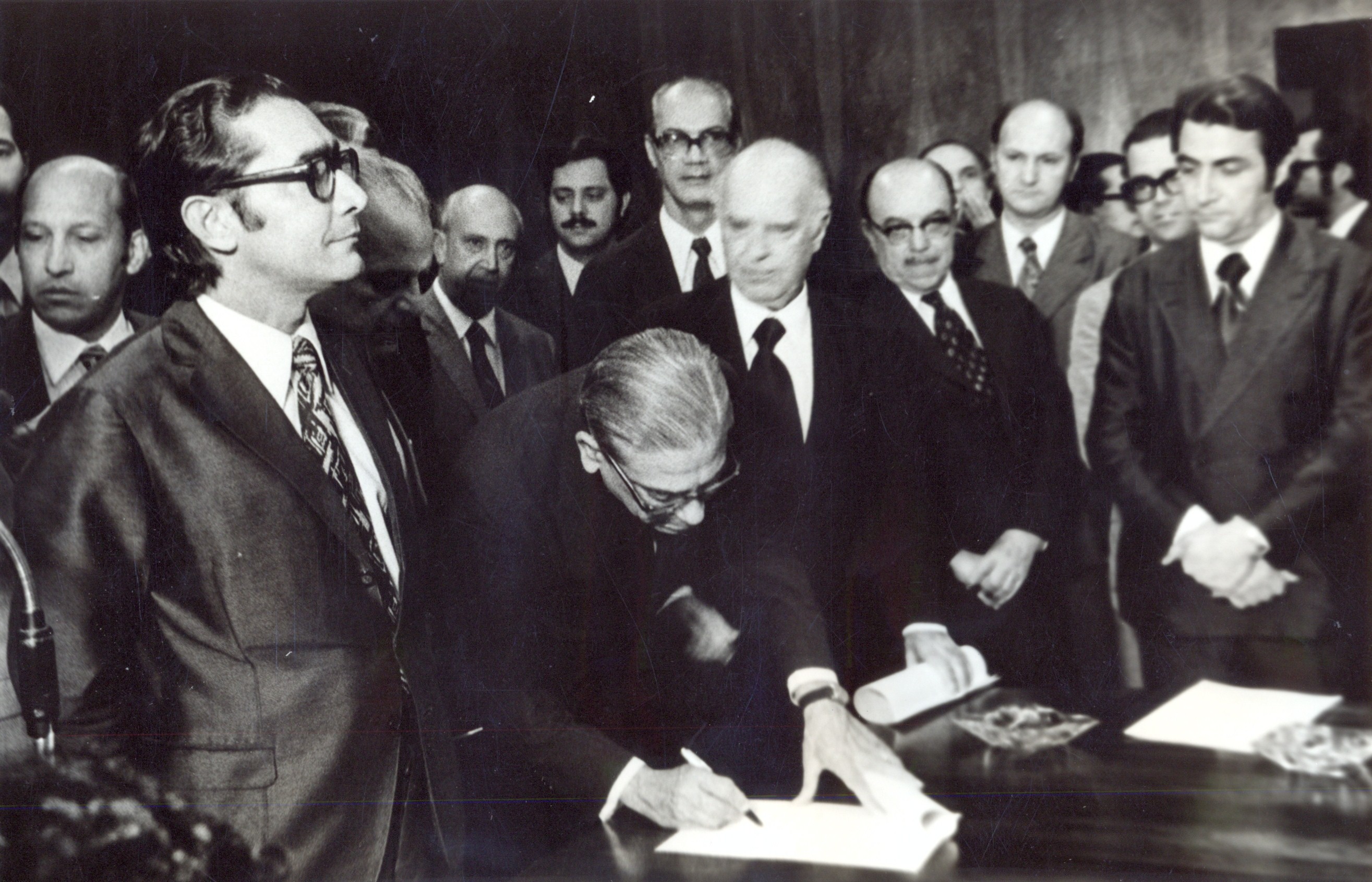 Assinatura do convênio entre o Ministério do Planejamento e a Fundação João Pinheiro (FJP), para execução de projetos de treinamento para altos executivos, como parte do "Programa Nacional de Treinamento de Executivos" (PNTE), criado pelo Ministério do Planejamento. Vê-se o ministro do planejamento, João Paulo dos Reis Veloso, além de outras autoridades.