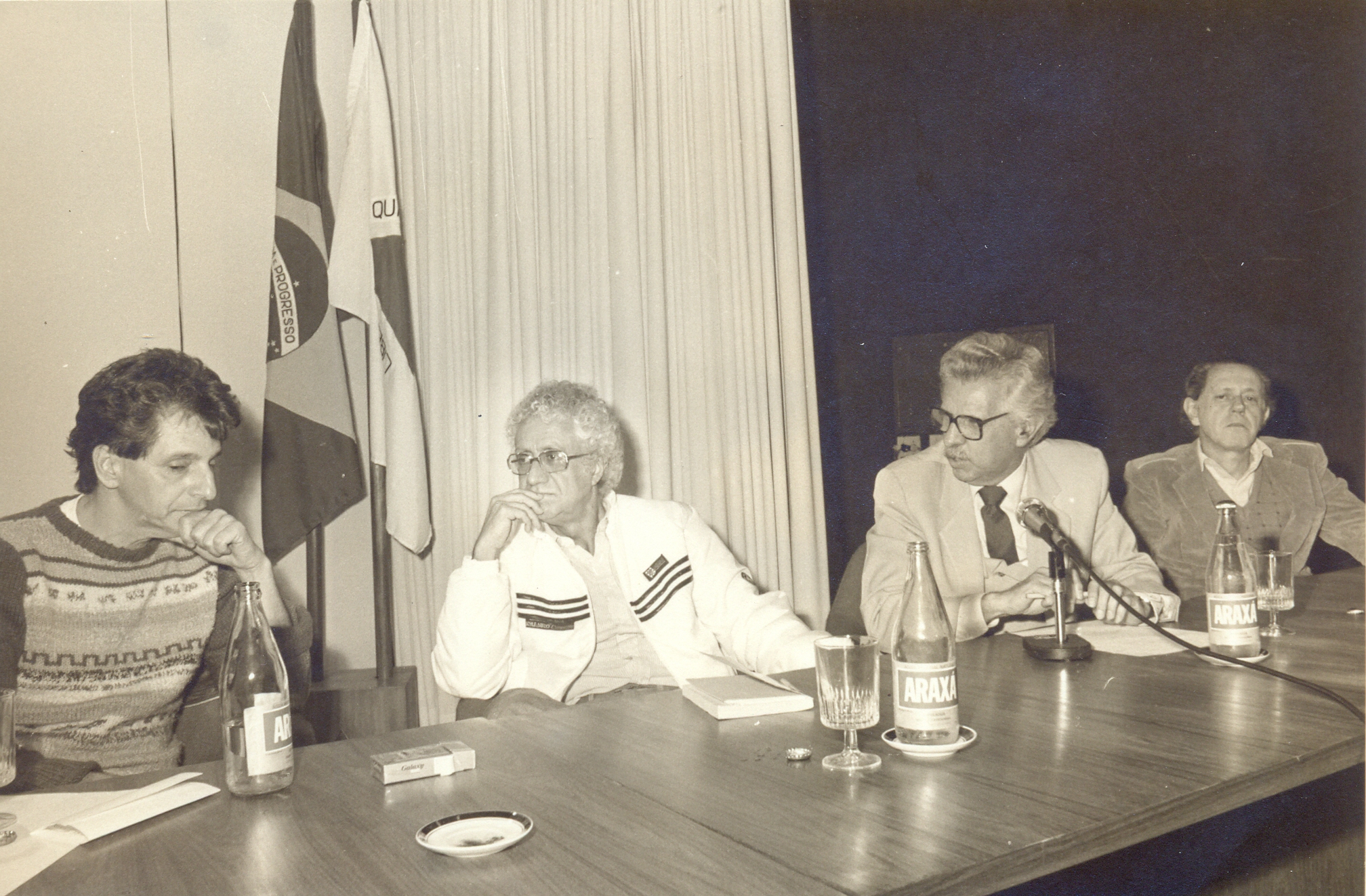 Seminário " Sociedade, Cultura e Tecnologia" promovido pela Fundação João Pinheiro (FJP) no auditório do Banco do Desenvolvimento de Minas Gerais (BDMG). Debate com Fernando Gabeira sobre seu livro "Diário da Crise" e encerramento do seminário. A partir da esquerda: Fernando Gabeira, Jarbas Nogueira de Medeiros da Silva, Aluísio Pimenta, presidente da FJP e Affonso Celso Ávila.