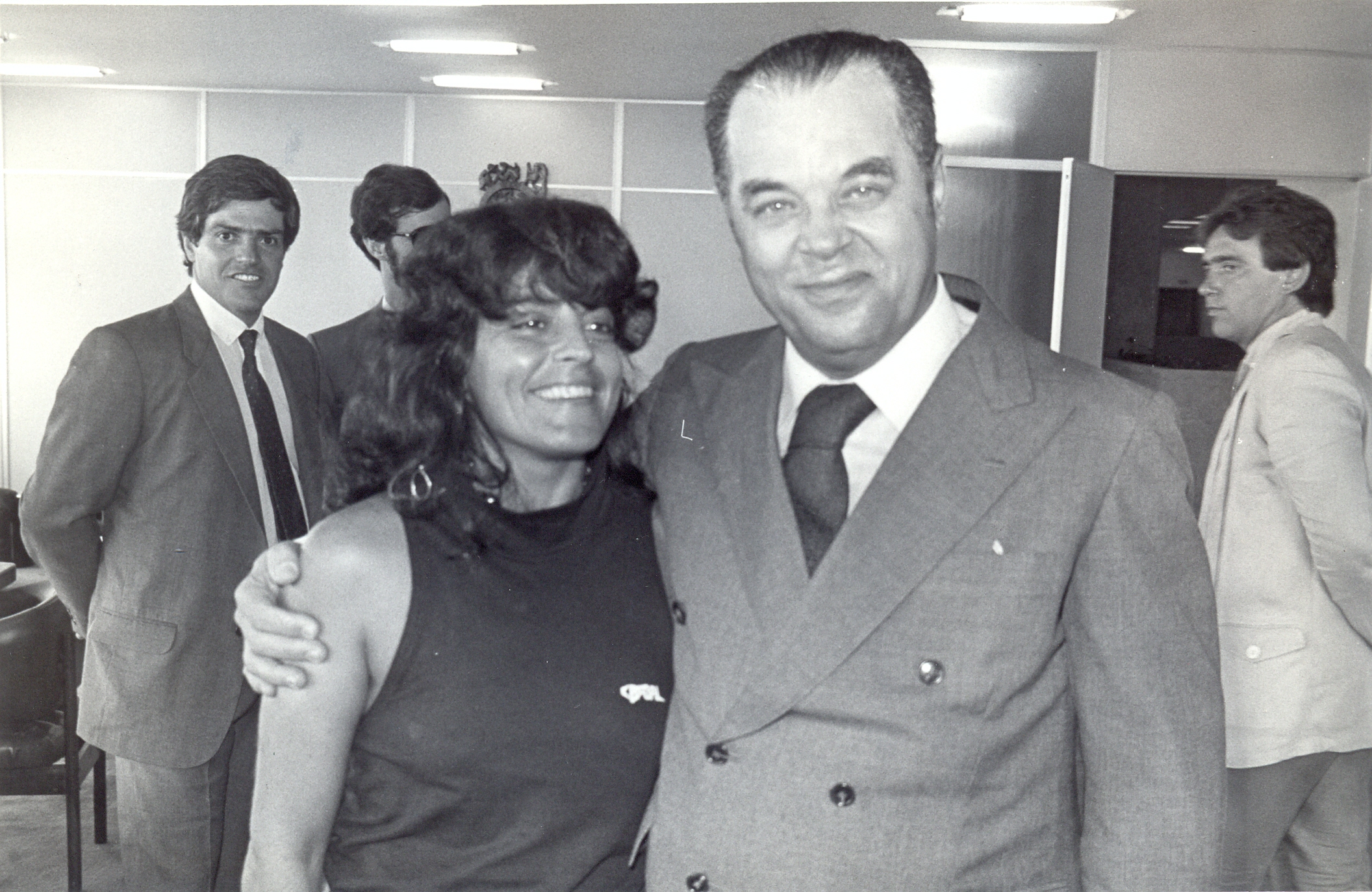 Inauguração da sede própria da Fundação João Pinheiro (FJP) na Pampulha. Vê-se na sala de reunião do Conselho Curador, a partir da esquerda, Roberto Uchôa Costa, Maria Solange de Castro Ataíde, Hindemburgo Chateaubriand Pereira Diniz e Rogério César Franco Mattos.