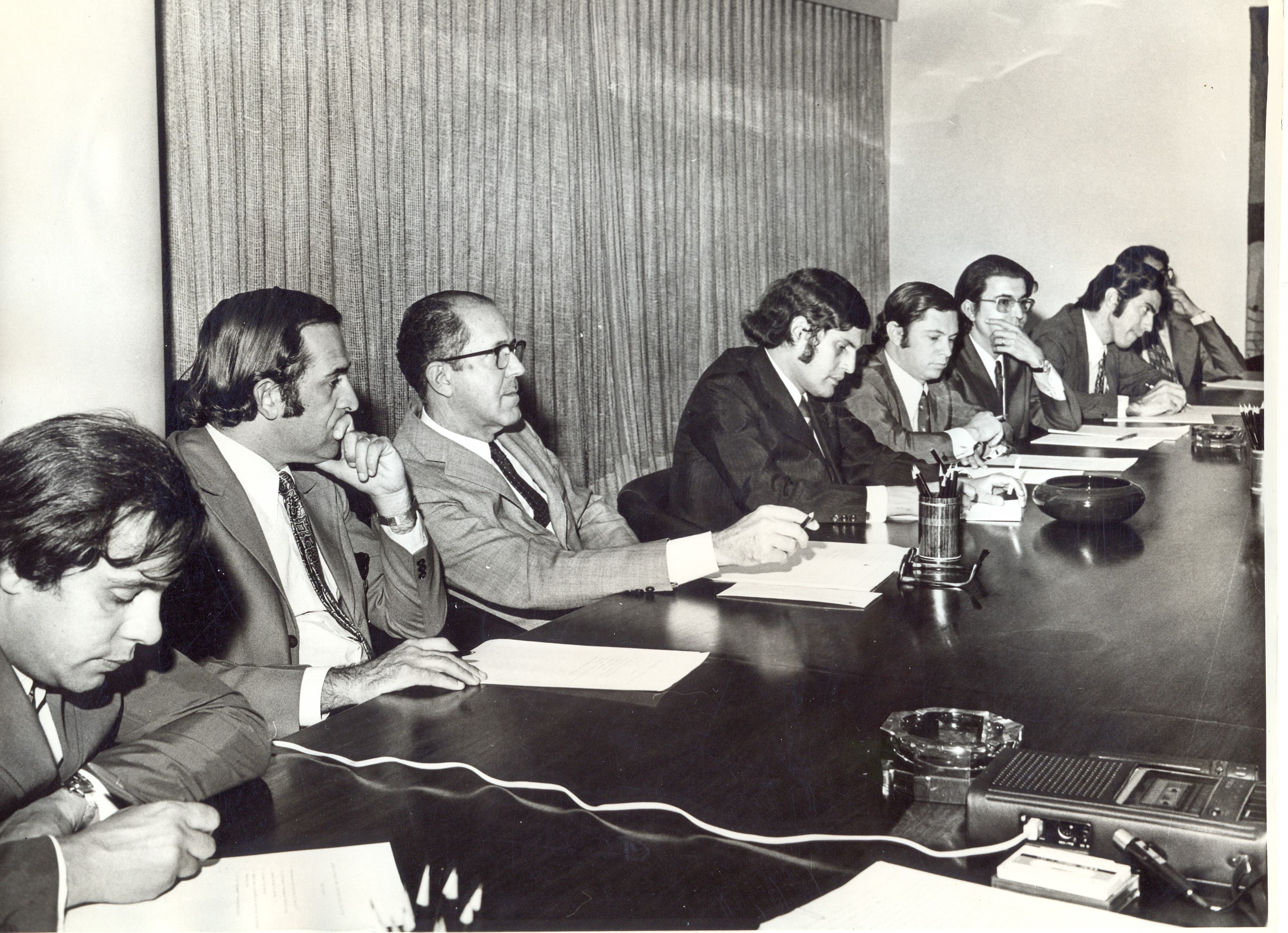 Visita do secretário do Planejamento Paulo José de Lima Vieira, para conhecer os trabalhos do Planejamento da Região Metropolitana de Belo Horizonte (PLAMBEL). Vê-se entre outros David Márcio Santos Rodrigues, diretor geral do Instituto de Geo-ciências Aplicadas, o secretário Paulo José de Lima Vieira e o subsecretário Roberto Lúcio Rocha Brant.
