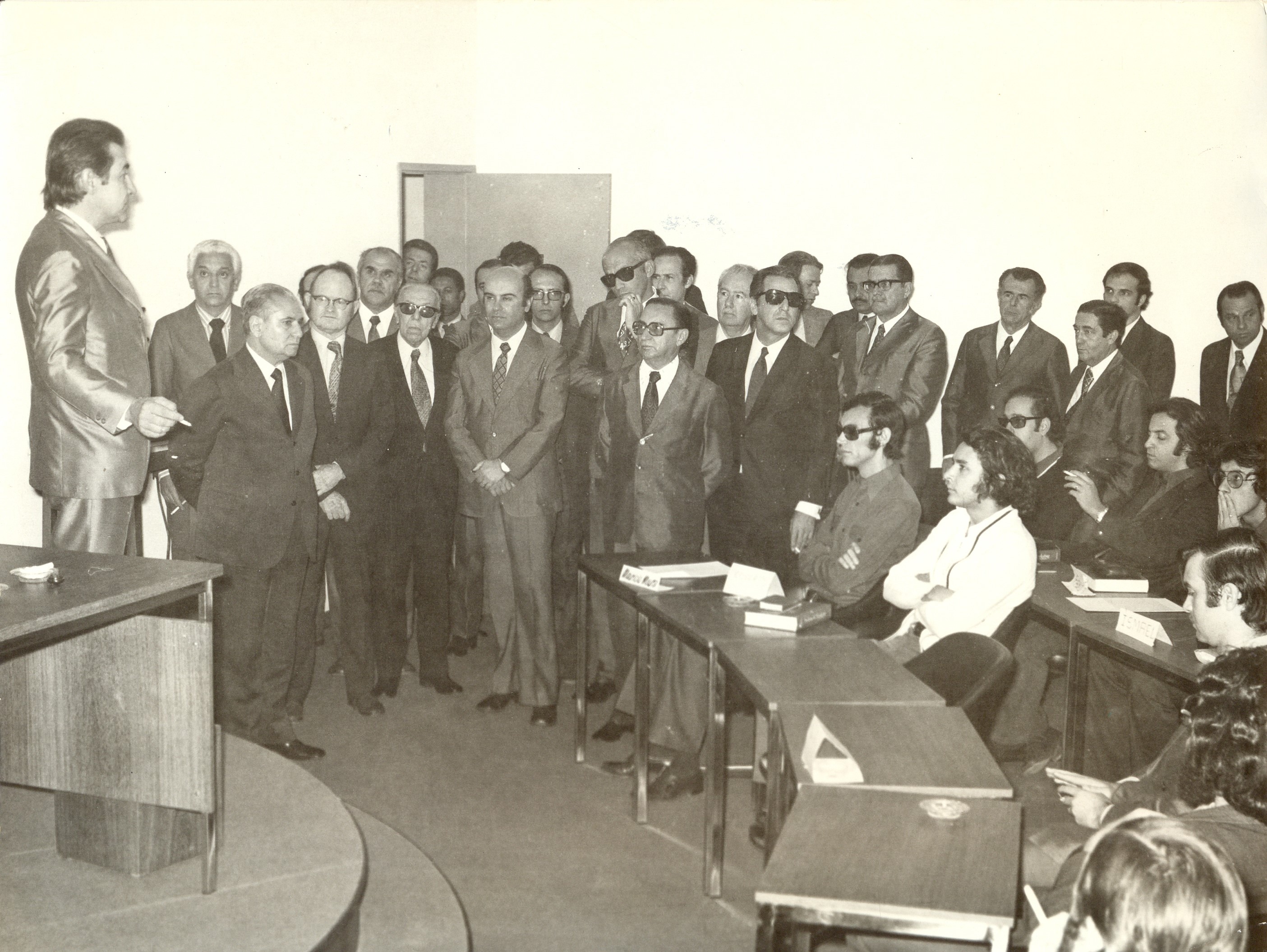 Visita do governador Rondon Pacheco ao Centro de Desenvolvimento em Administração (CDA). Na foto vê-se o presidente da Fundação João Pinheiro, saudava o governador, além dos alunos dos cursos do CDA e diversas autoridades. A partir da esquerda, atrás de Rondon Pacheco, vê-se Abílio Machado Filho, Garland Chester Owens, da Universidade de Columbia, etc.