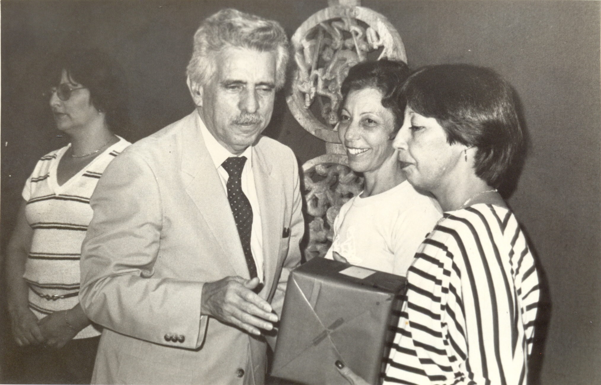 Homenagem às telefonistas da Fundação João Pinheiro (FJP). Vê-se Aluísio Pimenta, presidente da FJP apresenteando Maura Motta; ao lado Haydée Motta dos Santos, atrás, Ivone Ferreira da Silva.
