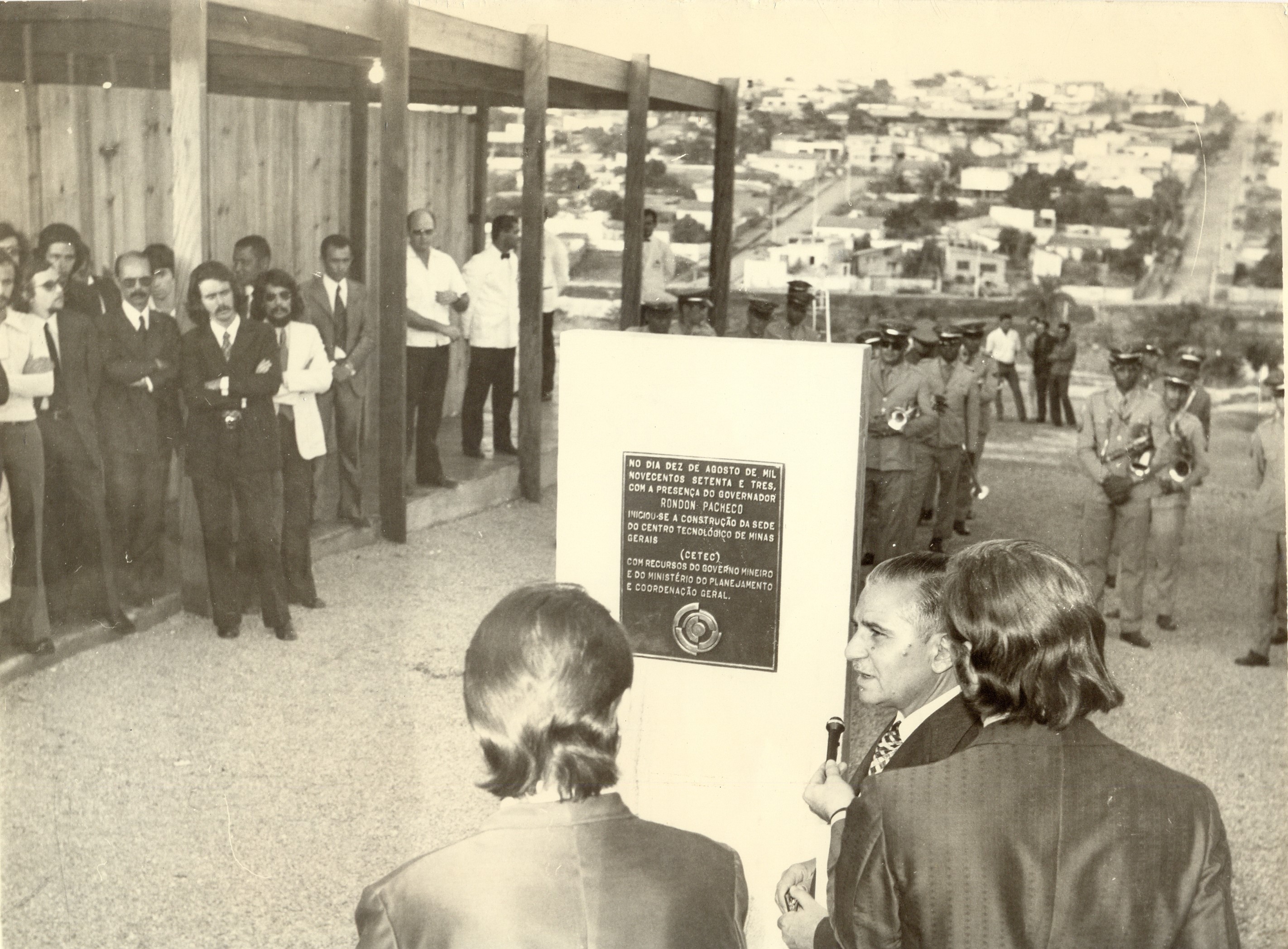 Lançamento da pedra fundamental da Fundação Centro Técnico (CETEC), pelo governador Rondon Pacheco. Vê-se o governador discursando, a banda da Polícia Militar e várias pessoas assistindo à solenidade.
