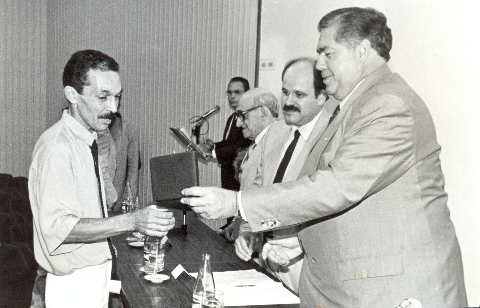 Solenidade comemorativa dos 20 anos da Fundação João Pinheiro (FJP), presidida pelo governador Newton Cardoso. Vê-se o funcionário Ruberley Santana Silva, recebendo a placa comemorativa dos 20 anos de casa, do governador Newton Cardoso. Vê-se também , Pio Soares Canedo e Roberto Gonçalves Pereira, presidente da FJP.
