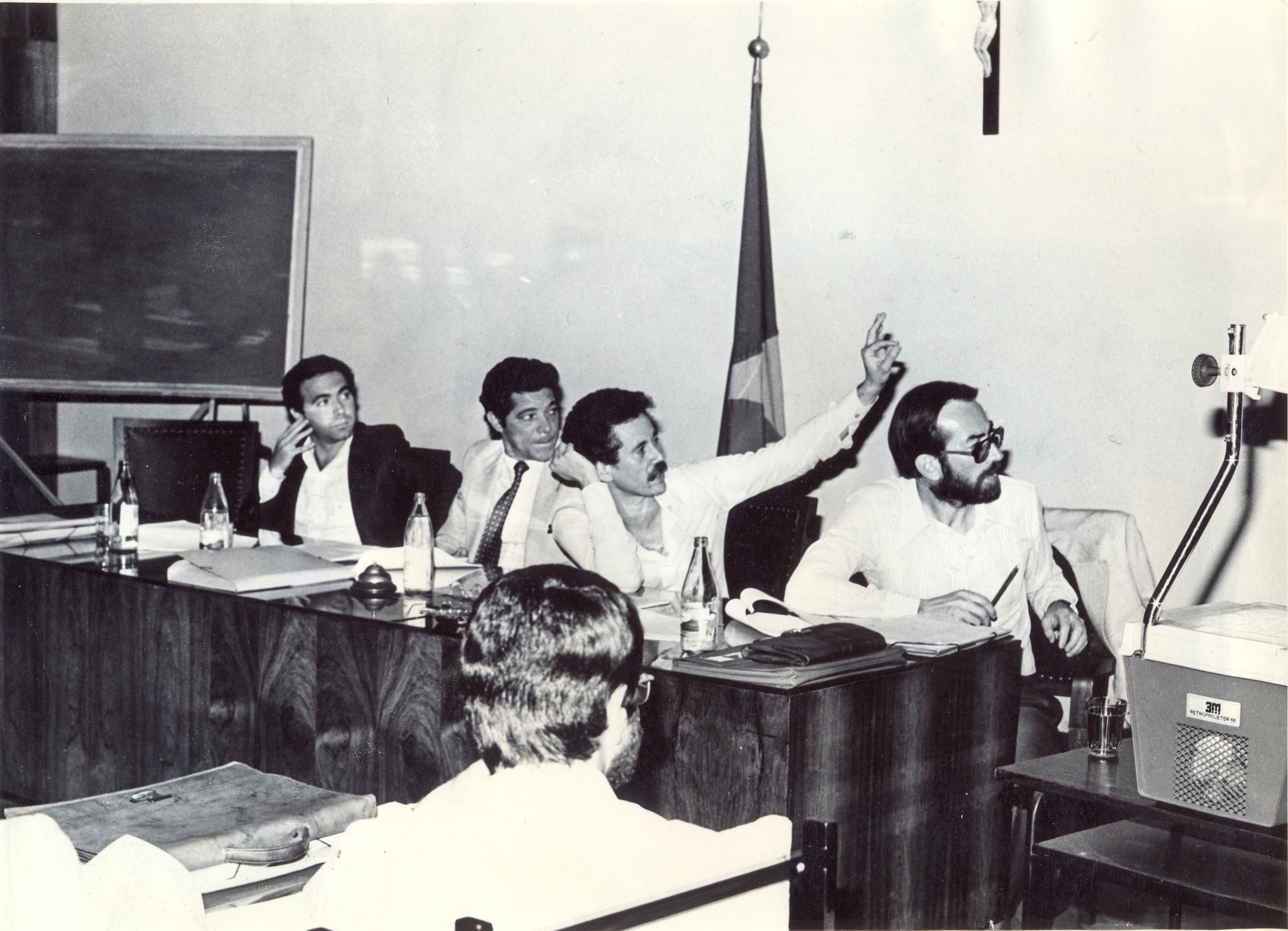 II Encontro Regional de Econometria, realizado na Faculdade de Ciências Econômicas da Universidade Federal de Minas Gerais (UFMG). Vê-se, da direita para a esquerda, os técnicos da Fundação João Pinheiro, Antônio Aguirre, José Afonso Bicalho Beltrão da Silva e Delso Morais da Silva.