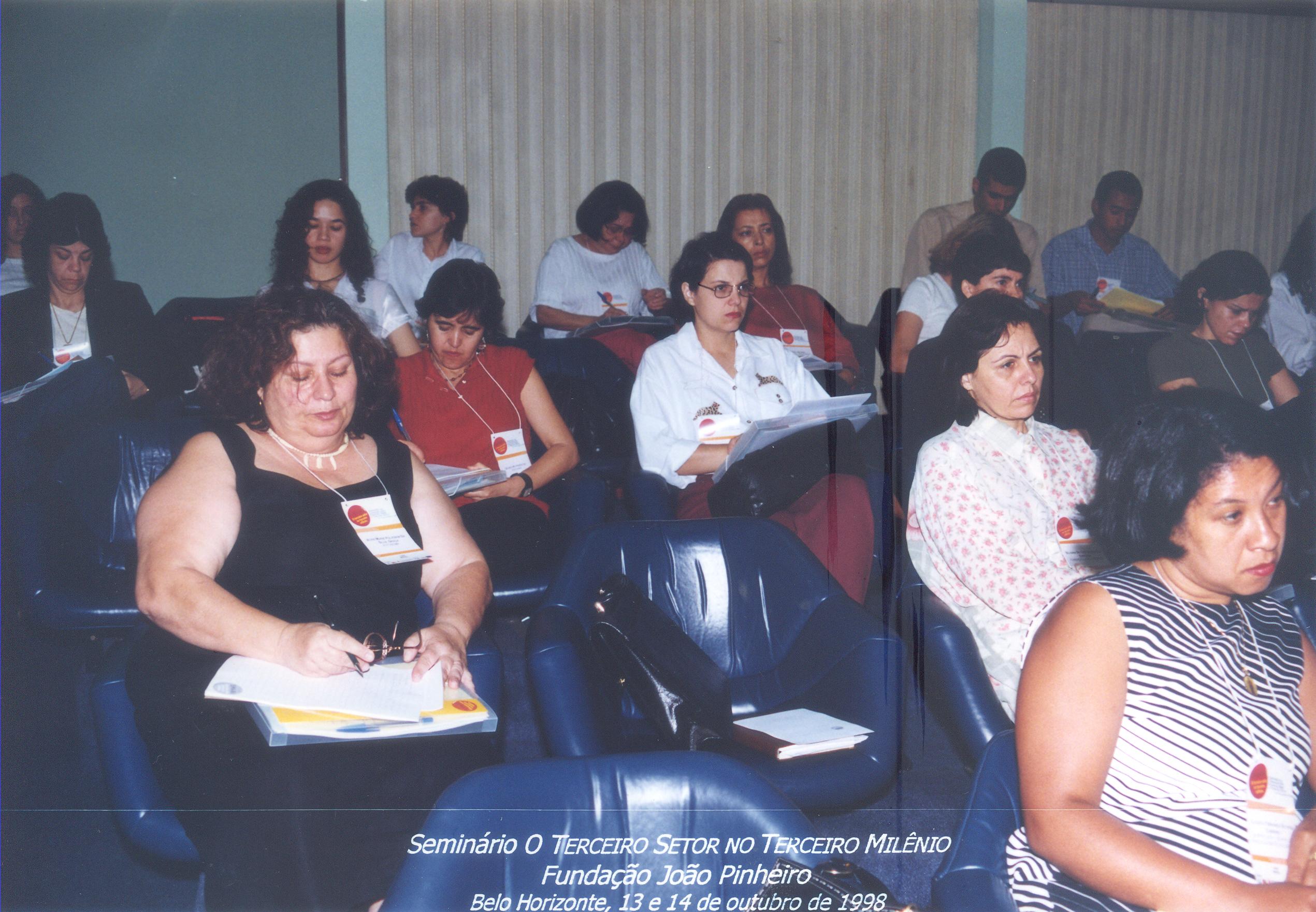 Imagem de Silvana Pessoa (CEHC/FJP), ao centro, e demais participantes do seminário O Terceiro Setor no Terceiro Milênio, no auditório principal da Fundação João Pinheiro, ocorrido nos dias 13 e 14 de outubro de 1998.