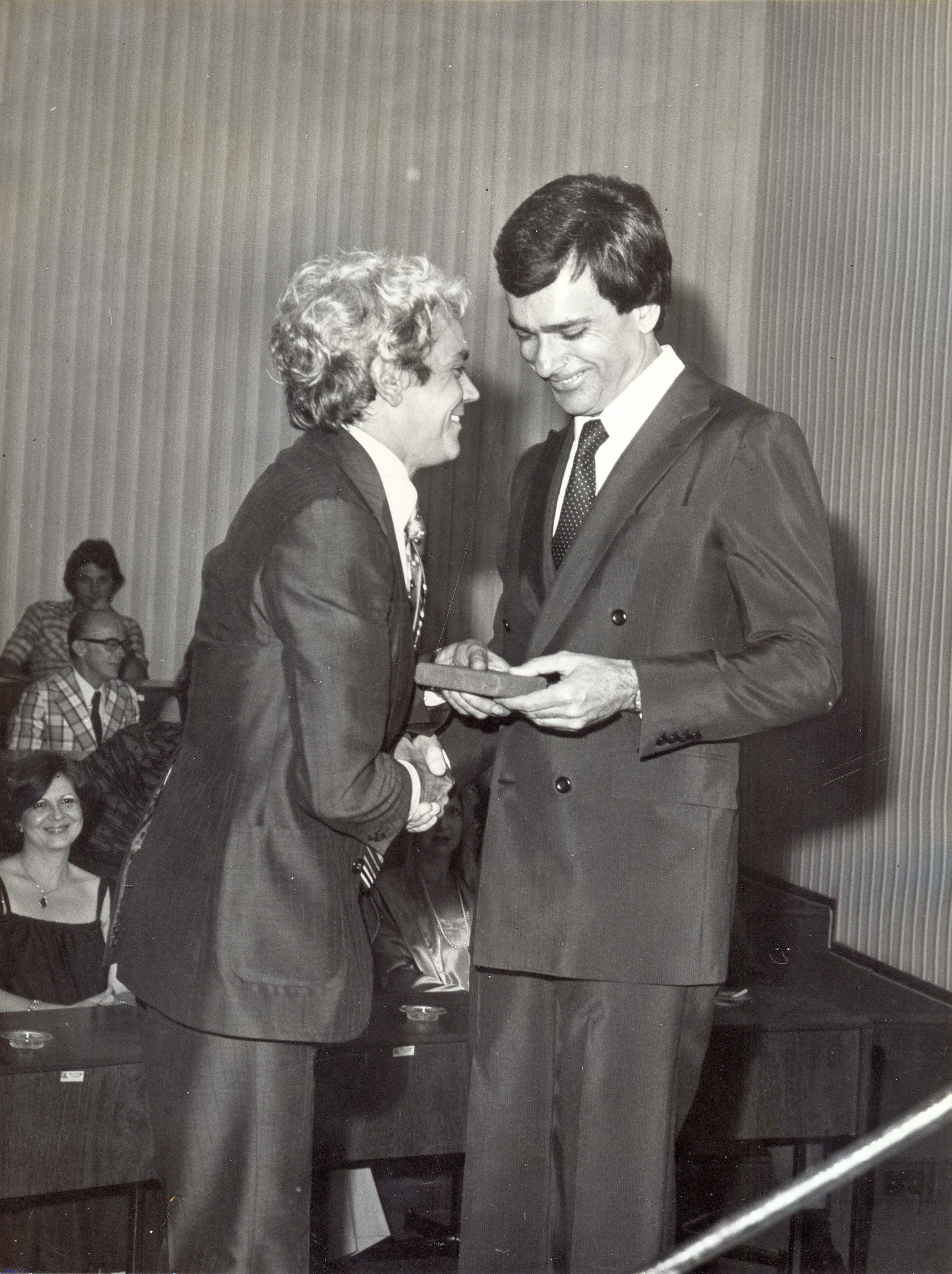 Entrega da placa de prata aos funcionários mais antigos, pela comemoração do 10° aniversário da Fundação João Pinheiro (FJP). Vê-se Antônio Octávio Cintra entregando a placa a Geraldo Majella Moreira Duarte.