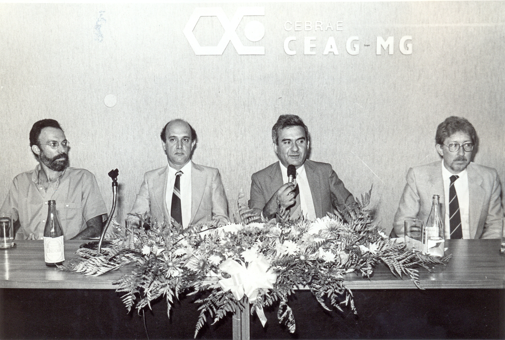 Formatura do XVII Curso de Especialização e Administração (CEA), no auditório do Centro de Assistência Gerencial de Minas Gerais (CEAG-MG). A partir da esquerda, vê-se: Luiz Fernando de Carvalho, da Fundação João Pinheiro (FJP); Luciano Amorim Borges, coordenador do curso; Vicente de Paula.