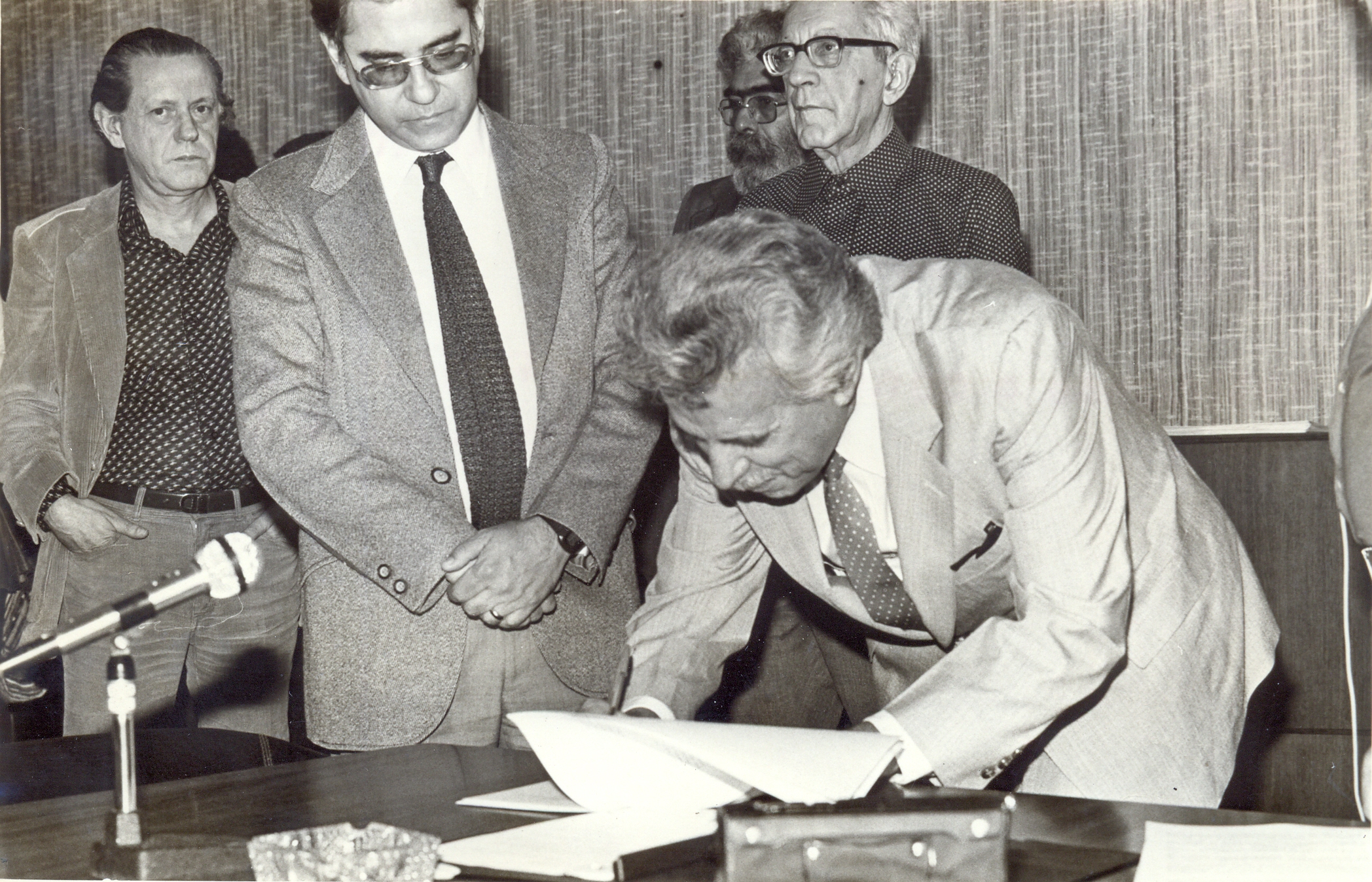 Assinatura do convênio entre a Fundação João Pinheiro (FJP) e o Centro Audio-visual da Universidade Federal de Minas Gerais (UFMG), para execução do Projeto "Memória Histórico-Fotográfica do Sul de Minas Gerais - 1870/1930", com o apoio da Fundação Nacional de Artes (FUNARTE). A partir da esquerda vê-se Affonso Celso Ávila; José Henrique Santos, reitor da UFMG e Aluísio Pimenta, presidente da FJP, assinando o convênio.