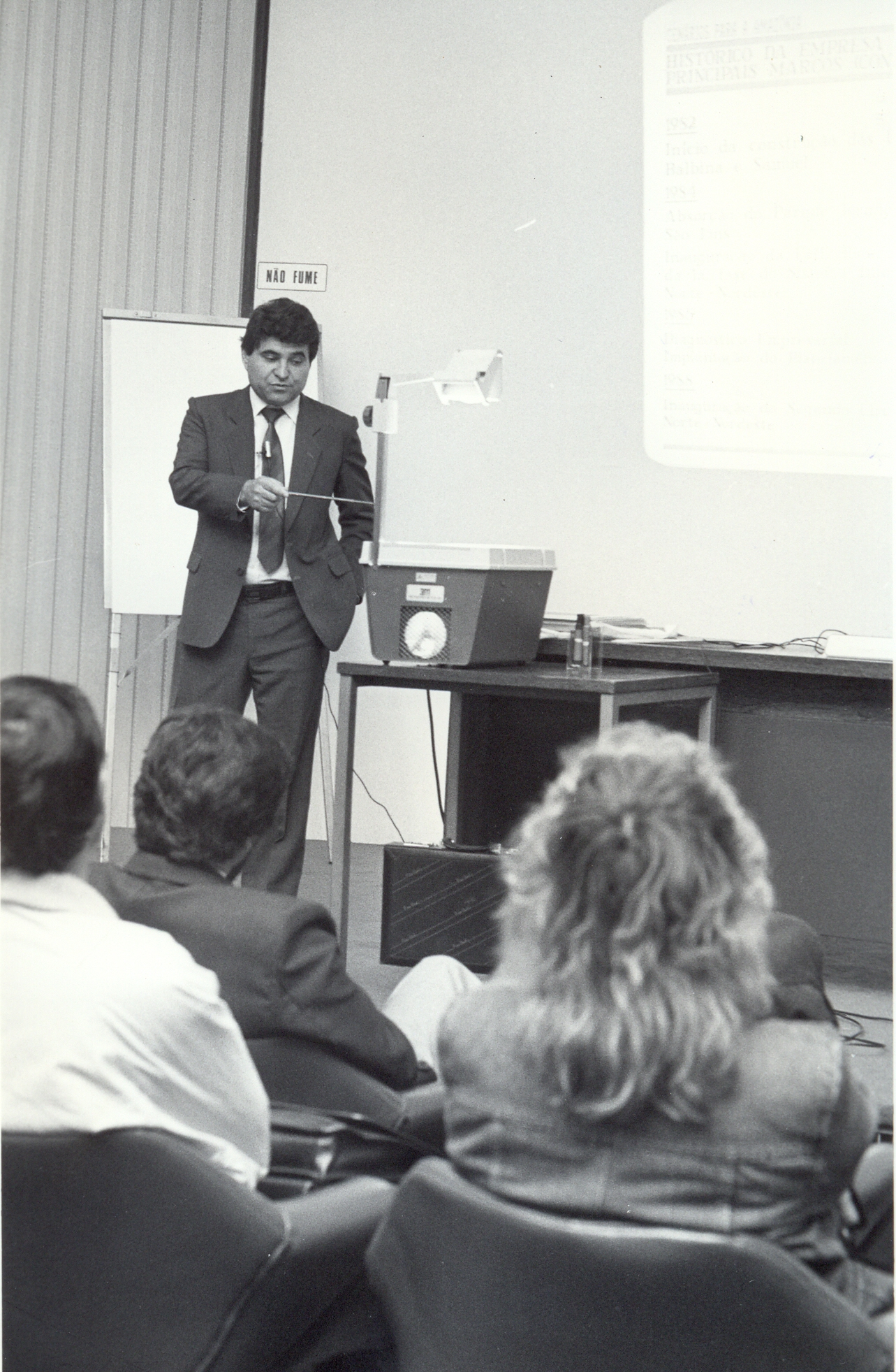 Palestra “Cenários Energéticos para a Amazônia”, proferida por Enéias Fernandes de Aguiar, gerente do departamento de estudos de mercado da Eletronorte. Vê-se conferencista.