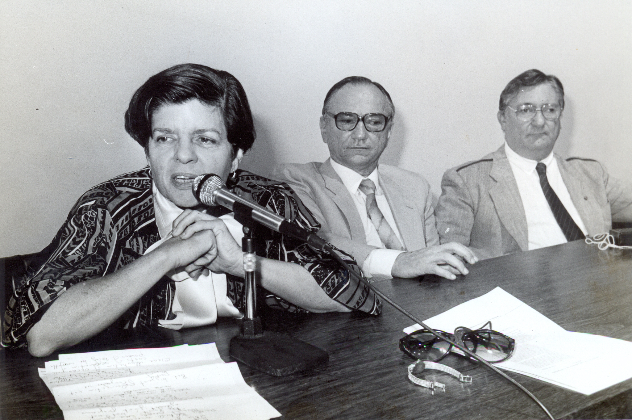 Conferencia da professora Alice Rivlin, sobre “Déficit Público”, na Fundação João Pinheiro (FJP). Vê-se a partir da esquerda: Alice Rivlin; Hamilton Parma, presidente da FJP e Antônio Lopes Sá.