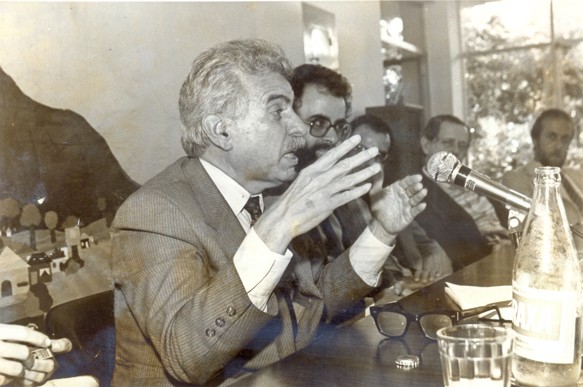 Apresentação da nova diretoria da Fundação João Pinheiro (FJP) no Centro de Desenvolvimento em Administração (CDA/FJP). Vê-se discursando, o novo presidente: Aluísio Pimenta; Teodoro Alves Lamounier, diretor da Diretoria de Projetos 1 (DP-I); Affonso Celso Ávila, diretor da Assessoria Técnica da Presidência (ATP) e Fernando Oliveira de Sá Andrade, secretário geral.