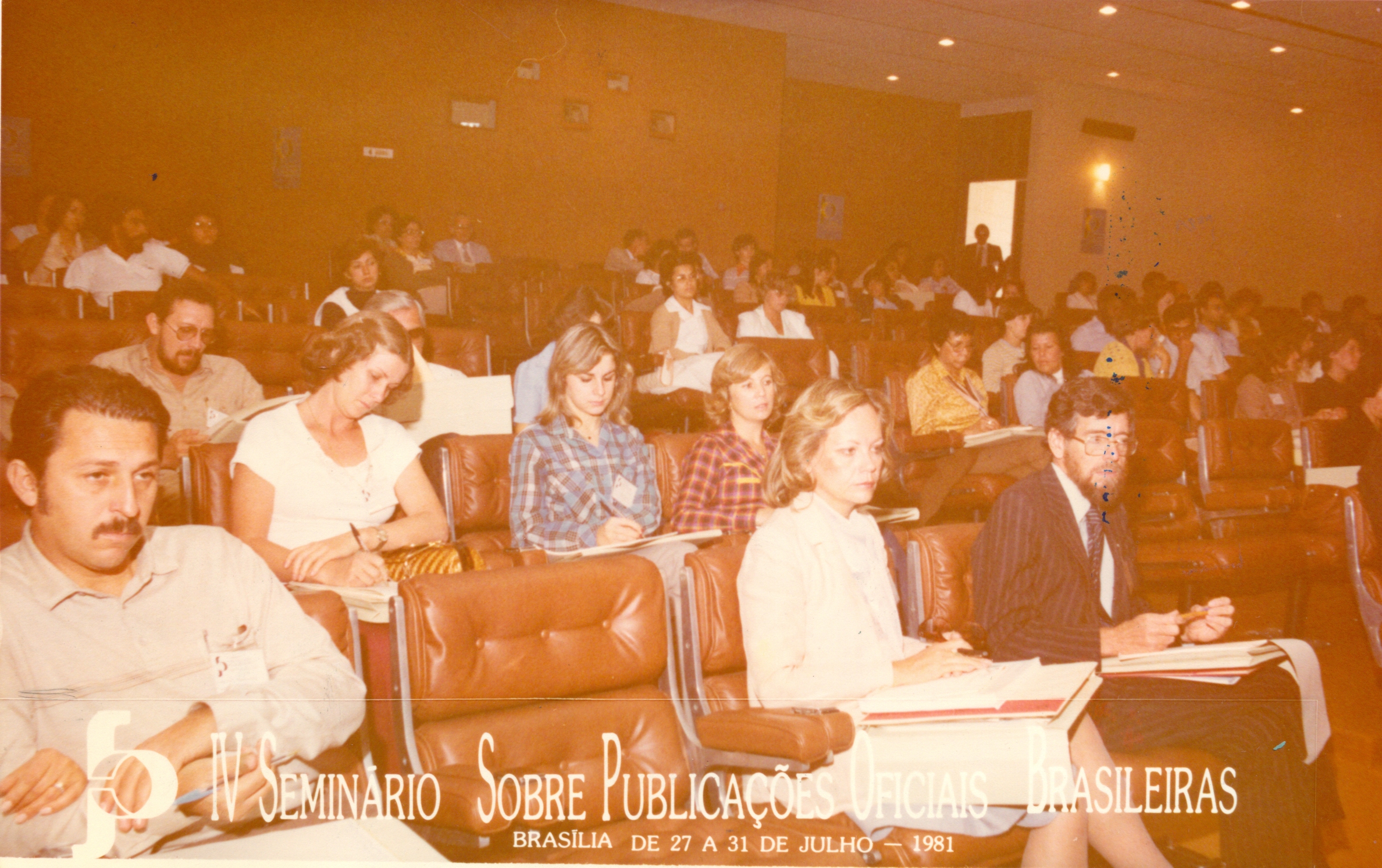IV Seminário sobre Publicações Oficiais Brasileiras, realizado em Brasília. Vê-se na platéia Helena Schirm, Maria Cecília Rubinger de Queiroz Otoni e Elvira Maria Falabella de Castro, funcionárias da Fundação João Pinheiro (FJP).