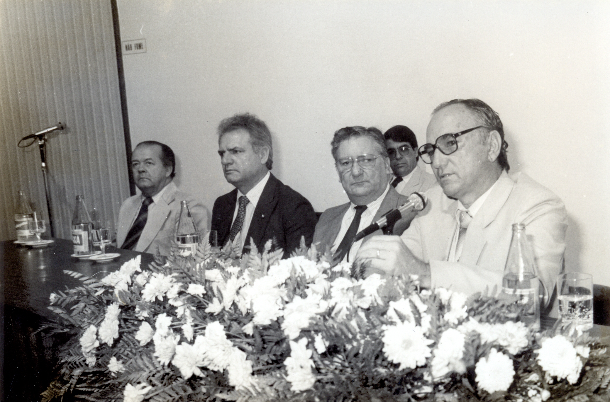 Aula inaugural do Curso de Auditoria Básica, no auditório da Fundação João Pinheiro, promovido pelo Centro de Contabilidade da Fundação João Pinheiro (FJP/CECON). Vê-se a partir da esquerda, Antônio Lopes Sá (3º) e Hamilton Parma, presidente da FJP, entre outros.