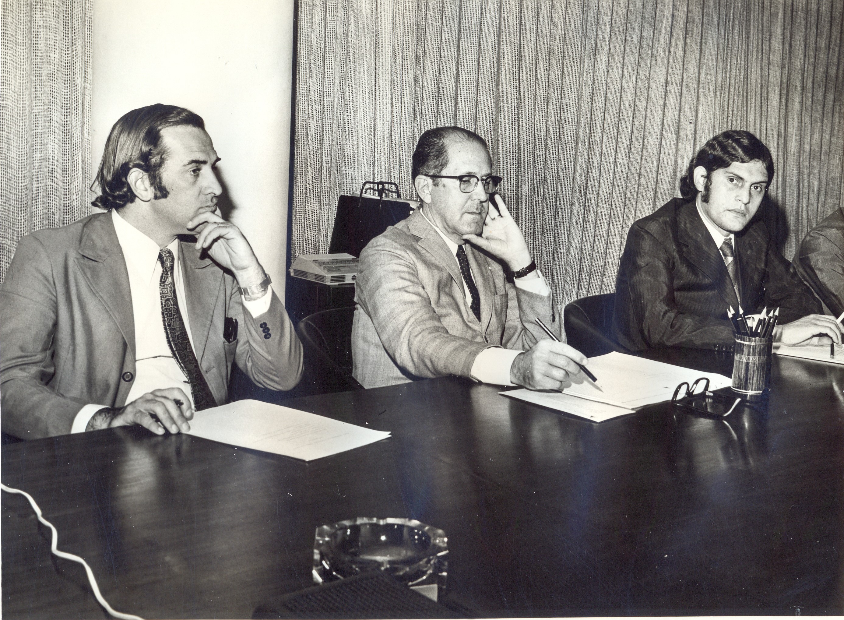 Visita do secretário do Planejamento, Paulo José de Lima Vieira, para conhecer os trabalhos do Planejamento da Região Metropolitana de Belo Horizonte (PLAMBEL). Vê-se o diretor geral do Instituto de Geo-Ciências Aplicadas, David Márcio Santos Rodrigues, o secretário do Planejamento e o subsecretário Roberto Lúcio Rocha Brant.