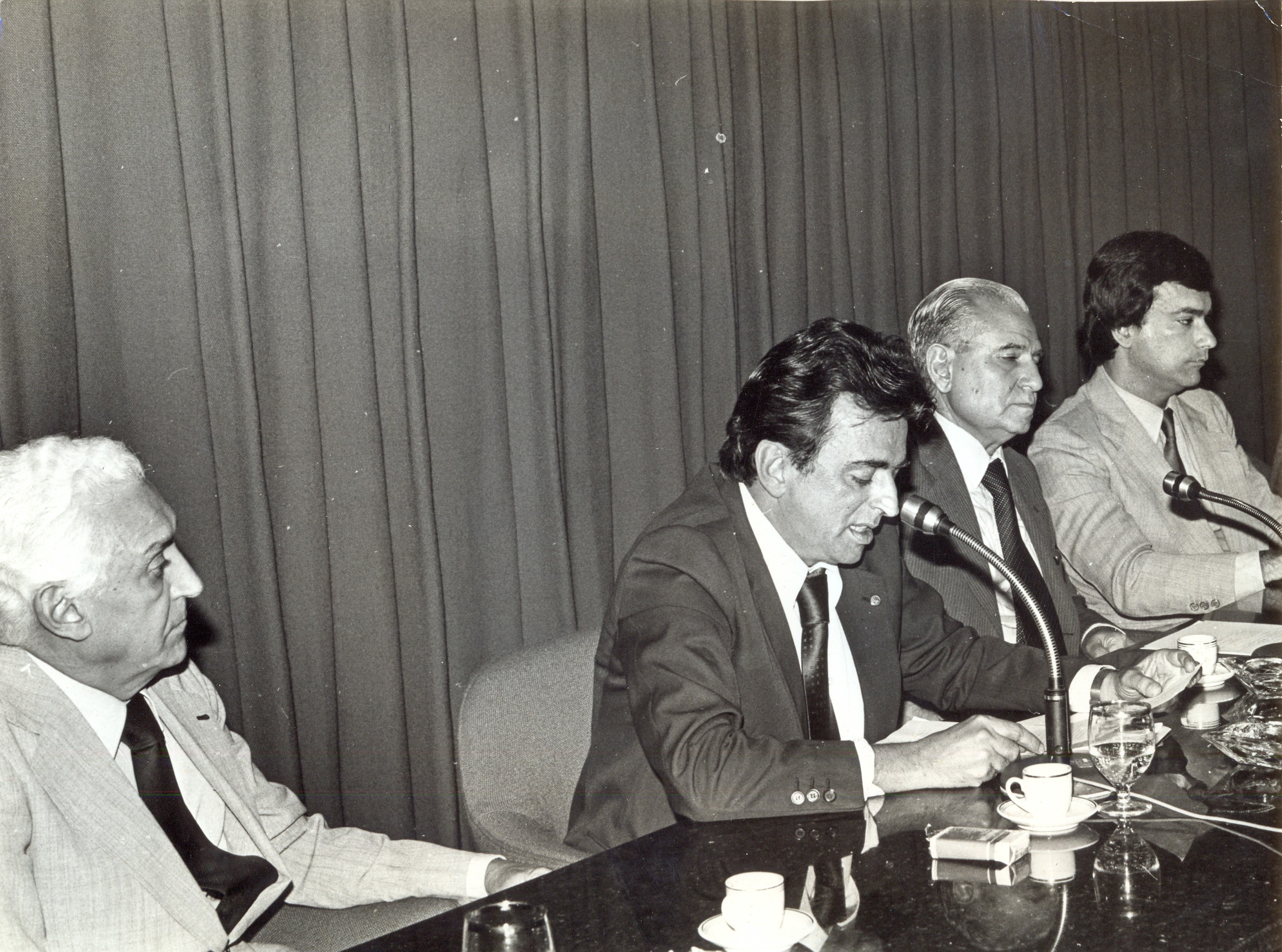 Simpósio "Minas Gerais década de 80", promovido pela Fundação João Pinheiro, na comemoração do seu 10° aniversário, no auditório do Banco de Desenvolvimento de Minas Gerais (BDMG). Vê-se Abílio Machado Filho; o conferencista Maurício de Freitas Teixeira Campos, prefeito de Belo Horizonte e o ex-governador Rondon Pacheco e Antônio Octávio Cintra, presidente da Fundação (FJP).