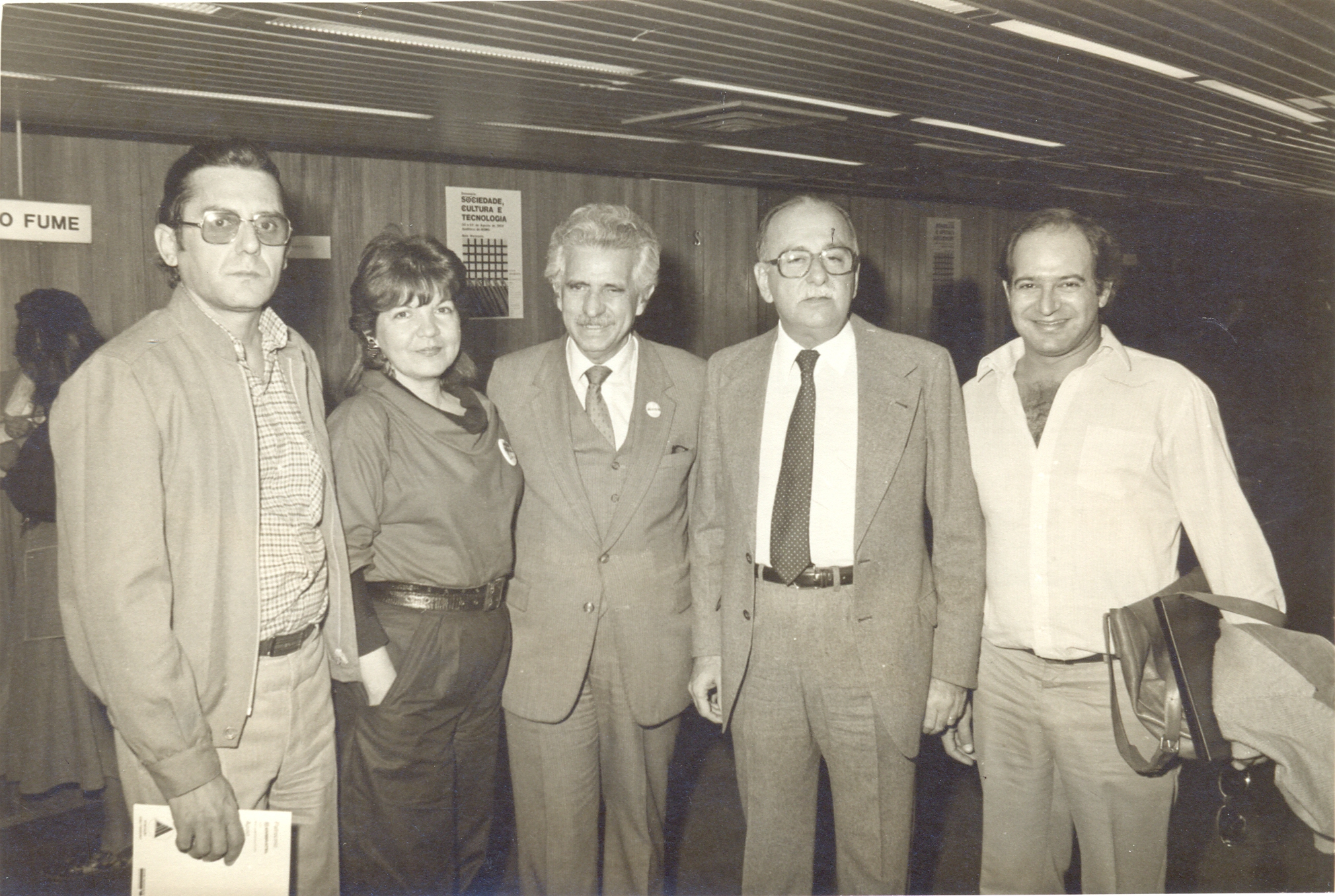 Seminário " Sociedade, Cultura e Tecnologia", promovido pela Fundação João Pinheiro (FJP), no auditório do Banco do Desenvolvimento de Minas Gerais (BDMG). Vê-se a partir da esquerda Raimundo Mendes Ferreira; Aluísio Pimenta, presidente da FJP; José Aparecido de Oliveira, secretário de Cultura, e outros.