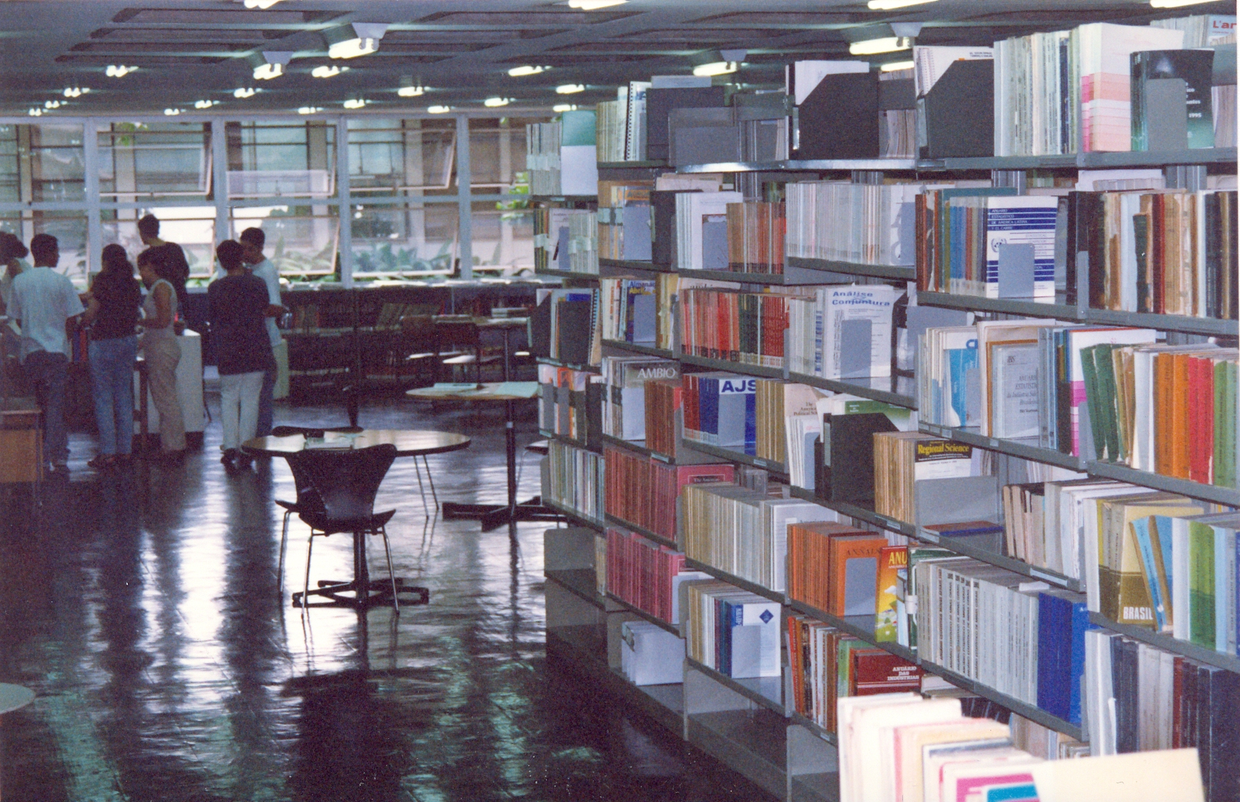 Registro fotográfico de estantes, livros, cadeiras, mesas e pessoas nas dependências da Biblioteca Professora Maria Helena de Andrade da FJP.