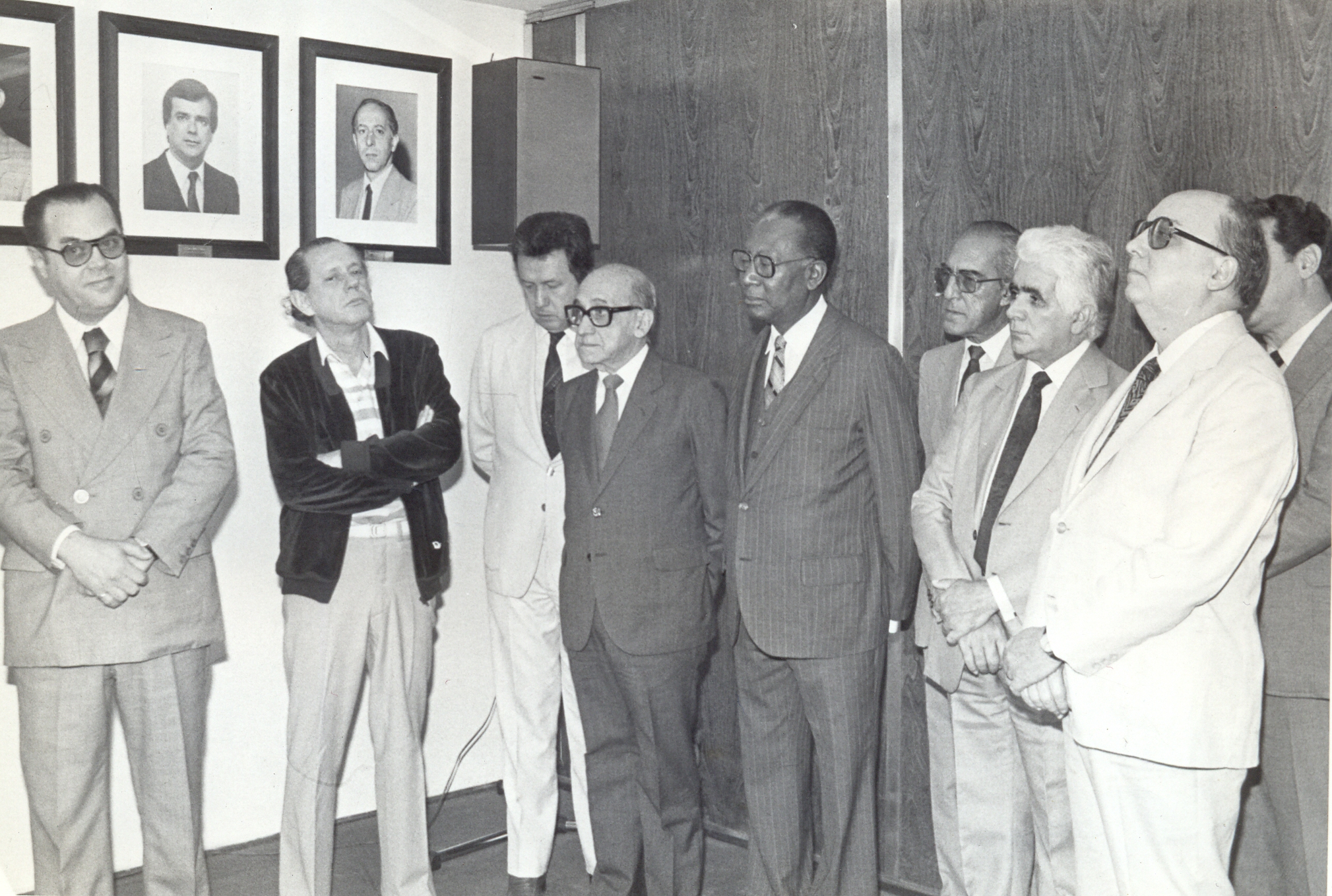 Solenidade de transmissão do cargo de presidente da Fundação João Pinheiro (FJP), para Hindemburgo Chateaubriand Pereira Diniz, no salão nobre da FJP, por Carlos Eduardo Côdo Aroeira, presidente em exercício, no salão nobre da FJP. Vê-se a partir da esquerda: Hindemburgo Chateaubriand Pereira Diniz, Affonso Celso Ávila, Geraldo Magela Barreto; Pio Soares Canedo; Raimundo cândido; Humberto Abreu Soares; Colivan Ferreira Lima e José de Mesquita Lara.