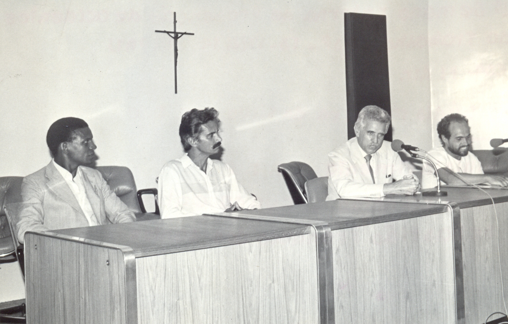 I Semana Interna de Prevenção de Acidentes do Trabalho (I SIPAT), realizada no auditório da Minas Caixa, de 13 a 17 de fevereiro, promovida pela Comissão Interna de Prevenção de Acidentes (CIPA) da Fundação João Pinheiro (FJP). A partir da esquerda vê-se Sebastião Francisco dos Santos da FJP; João Cândido do Ministério do Trabalho e Emprego (FUNDACENTRO); Aluísio Pimenta, presidente da FJP e Cláudio Moreira da Silva, presidente da CIPA/FJP.