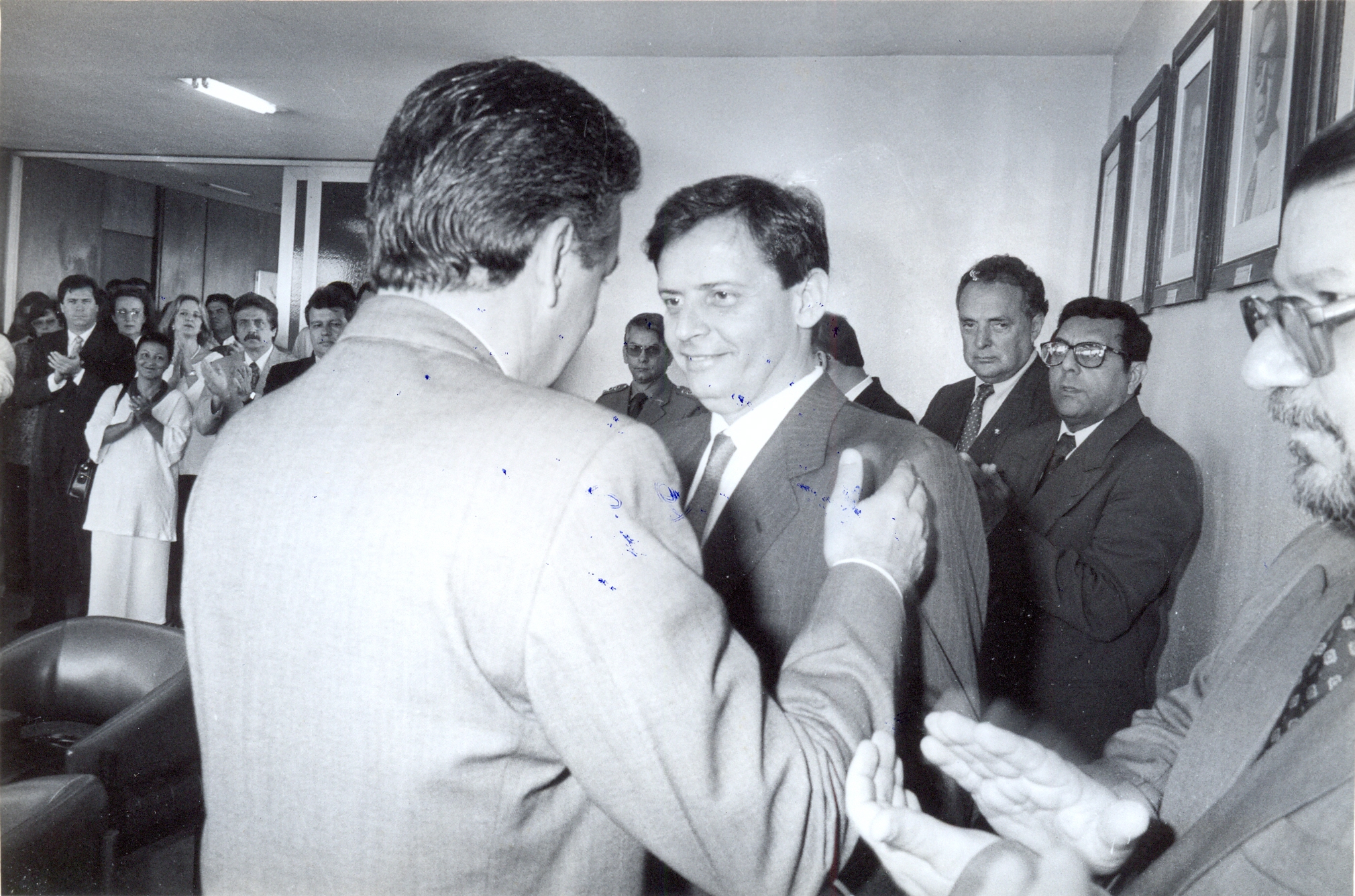Walfrido dos Mares Guia cumprimenta Roberto Borges Martins recém-empossado presidente da Fundação João Pinheiro. Ao fundo à direita, José Ulisses de Oliveira e Ademir Lucas Gomes.