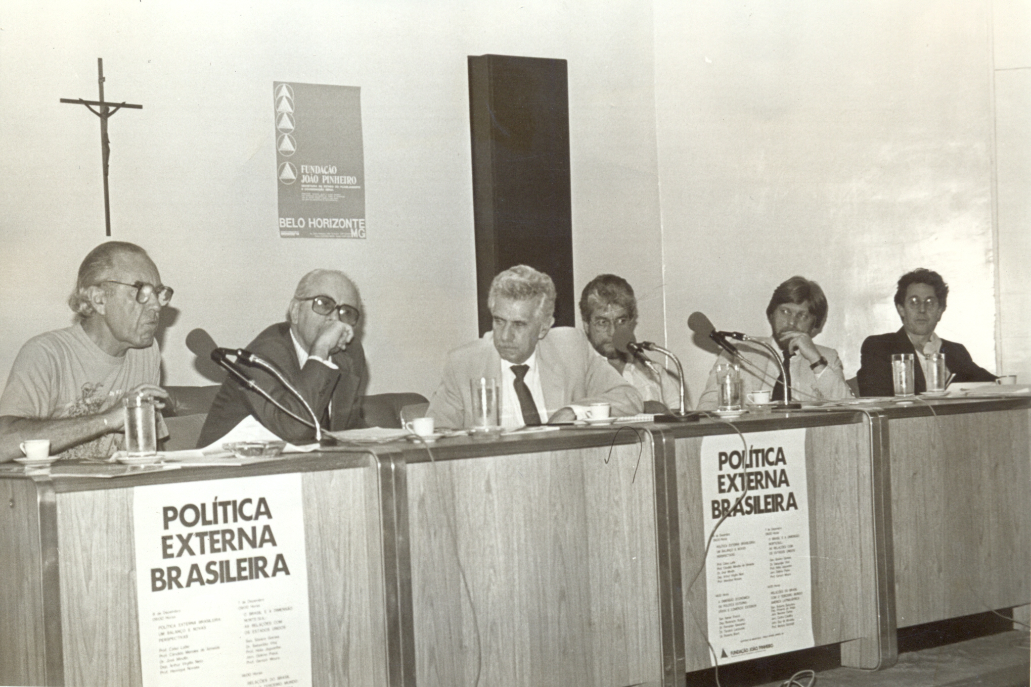 Seminário "A política externa brasileira" promovido pelo Núcleo de Relações Internacionais da Fundação João Pinheiro (FJP) no auditório da Minas Caixa. A partir da esquerda vê-se Newton Carlos, jornalista, Guy de Almeida, jornalista; Aluísio Pimenta, presidente da FJP, Carlos Castilho, jornalista, e outros.