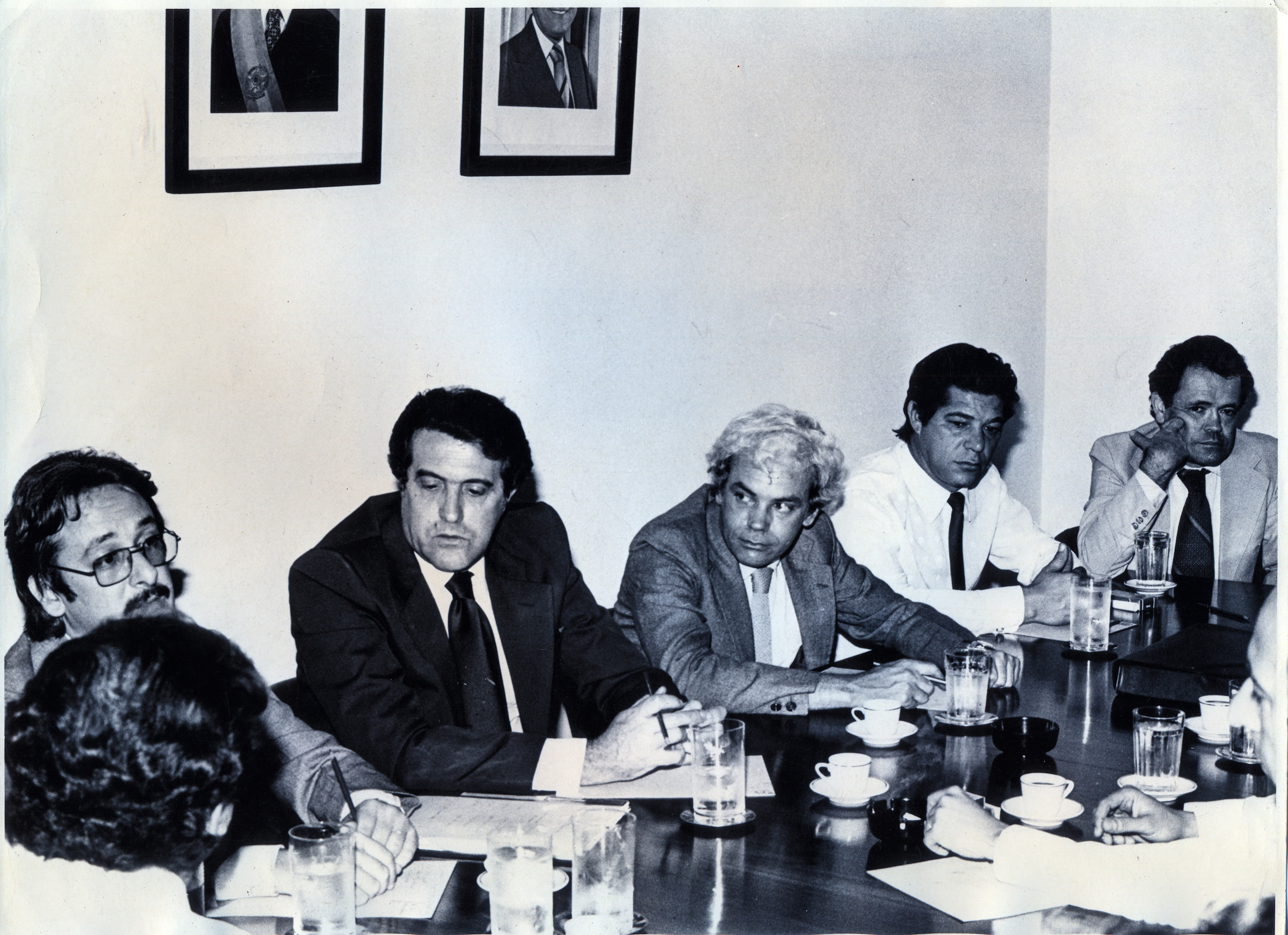 Assinatura do convênio entre SEPLAN-PR/ SAREM/ governo do Estado de Minas Gerais-SEPLAN-MG e Fundação João Pinheiro, para o Programa de Treinamento em Administração Municipal - PTAM, a ser executado pelo CDA da Fundação João Pinheiro (FJP), com a utilização de tecnologia de video-cassete para treinamento a distância e em massa. Vê-se, Carlos Armando Gontijo César da SEPLAN-MG, Geraldo Majella Moreira Duarte, diretor da Fundação João Pinheiro (FJP)/DPSU, Delso Morais da Silva, diretor da Fundação João Pinheiro (FJP)/DP, Jayme Tobias Blay, do CDA.