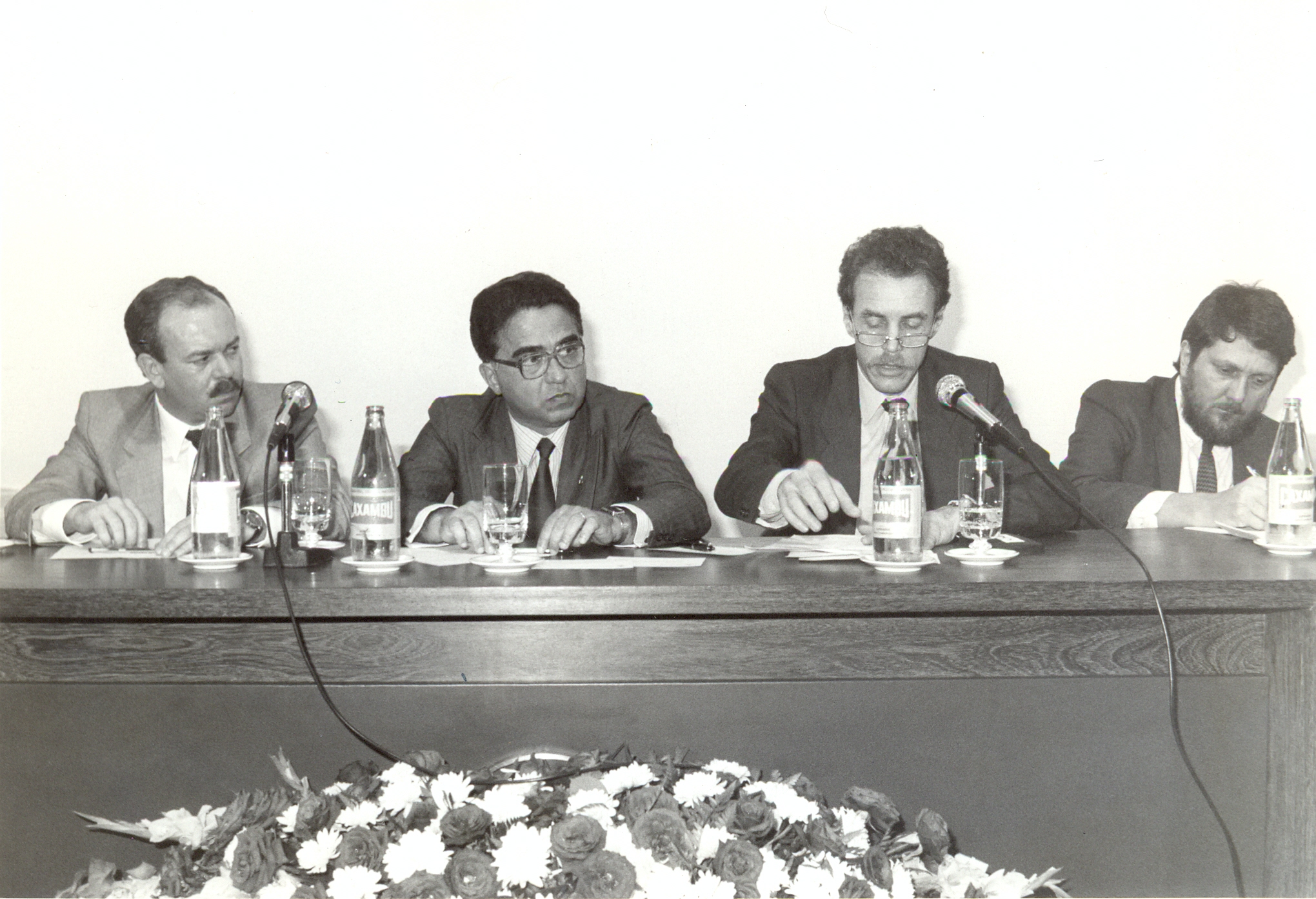 Seminário “Cenário para a economia brasileira - 1987/2000”, no auditório da Fundação João Pinheiro (FJP), promovido pela Secretaria de Planejamento (SEPLAN) e FJP. Vê-se a partir da esquerda: o presidente da FJP; Aluízio Gonçalves Werneck; Alípio Pires Castello Branco, secretario estadual do planejamento; Júlio Olinto Fusaro Mourão, superintendente da Área de planejamento do BNDES e o presidente do CICI, Stefan Bogdan Salej.